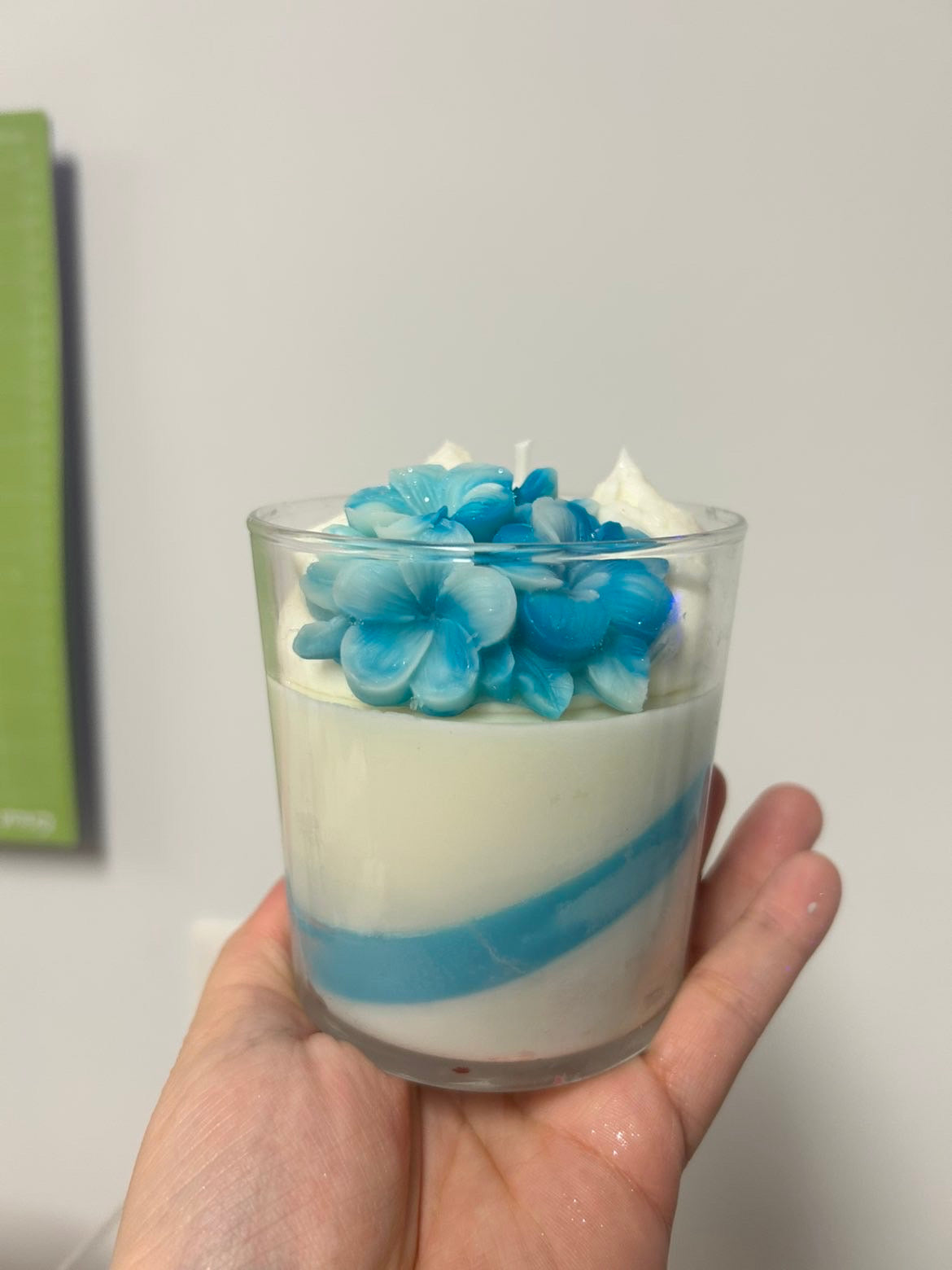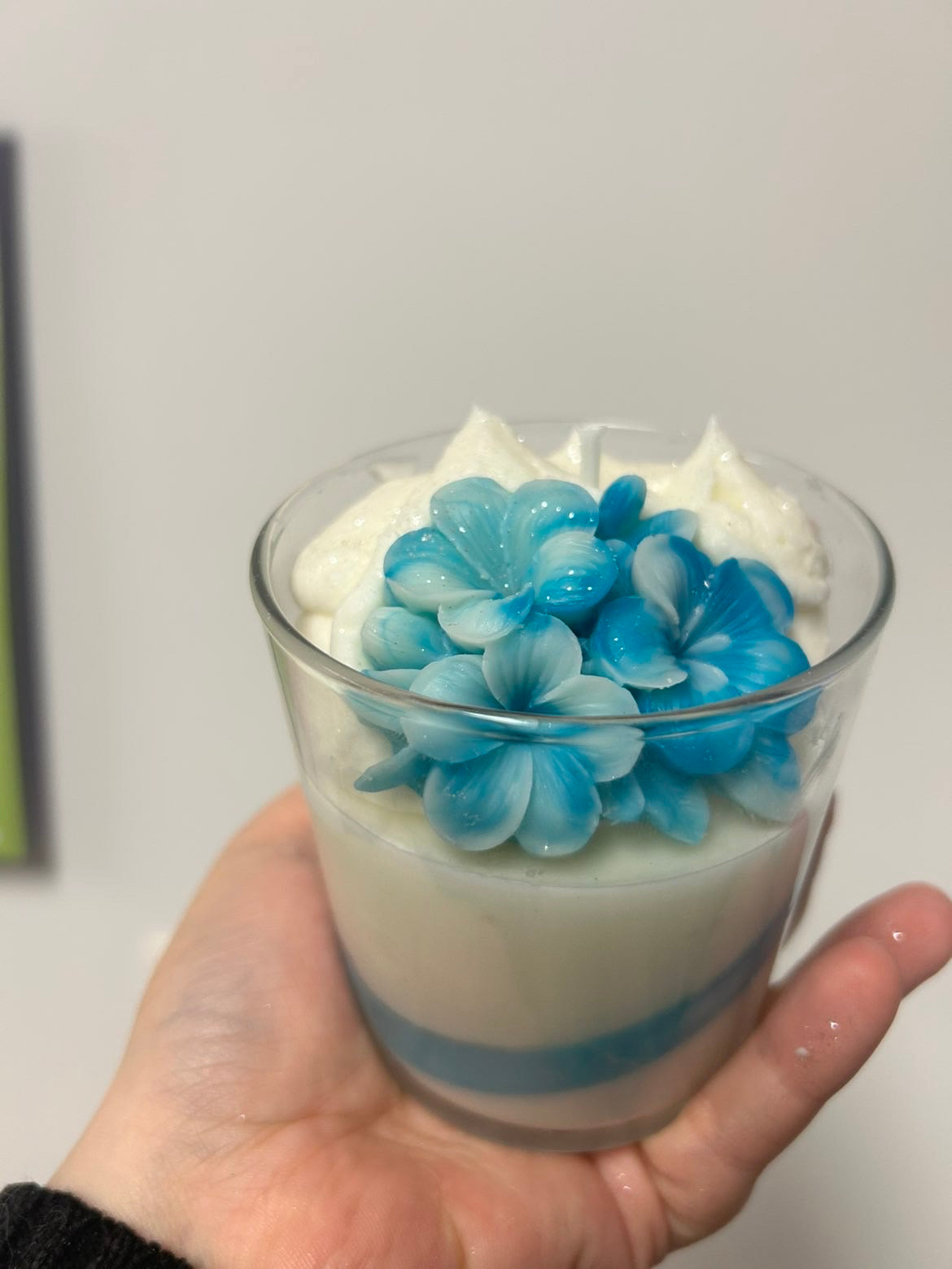 Parfum & Visuel : Souffle Glacé Floral – une fragrance délicate et aérienne, qui évoque la pureté de la neige fraîche. La cire est sublimée par une décoration en "chantilly" crémeuse, une fleur décorative, et des nuances élégantes de bleu turquoise et de blanc. Une véritable œuvre d'art pour l'hiver.